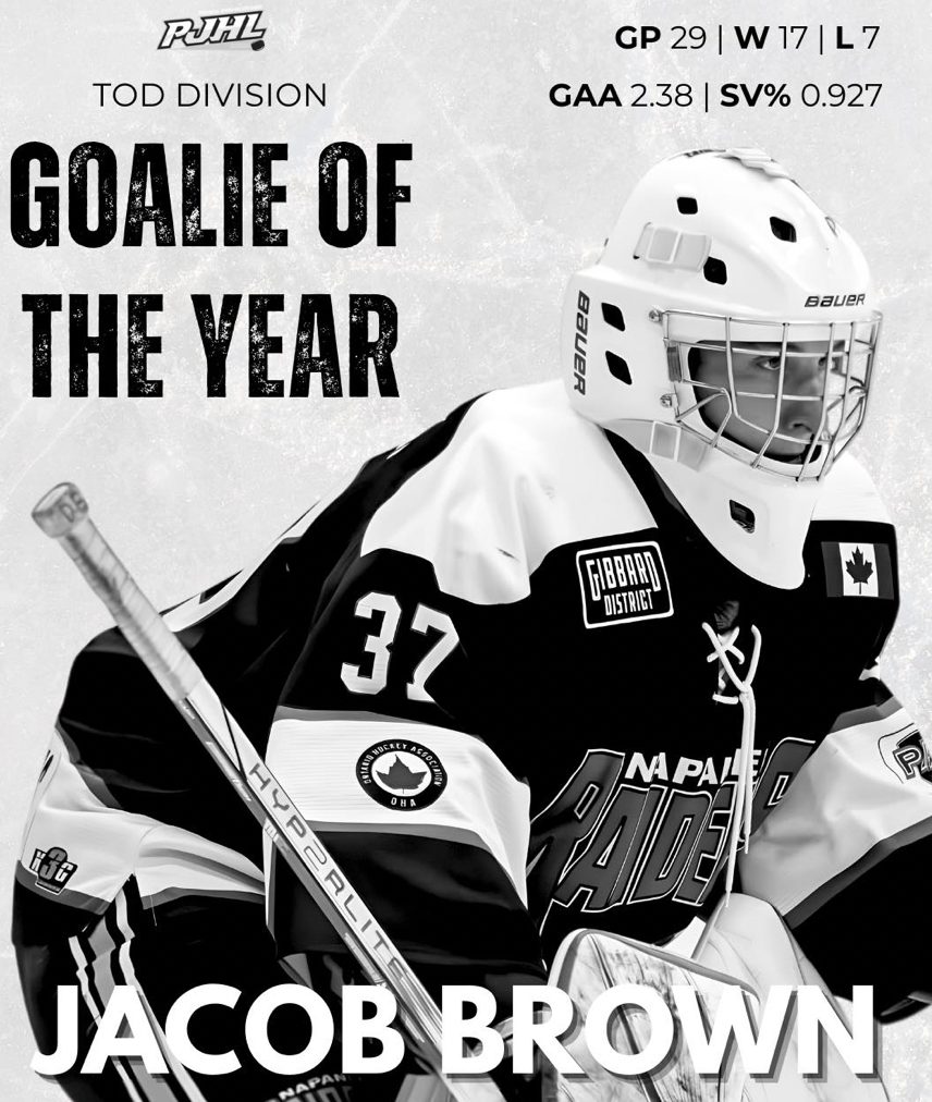 NAPANEE, ON — The Provincial Junior Hockey League (PJHL) has officially announced its 2025-2026 season awards, naming Jacob Brown of the Napanee Raiders as the Tod Division Goalie of the Year. Brown, a native of Yarker, Ontario, emerged as a foundational piece for the Raiders this season after joining the club with an impressive pedigree.