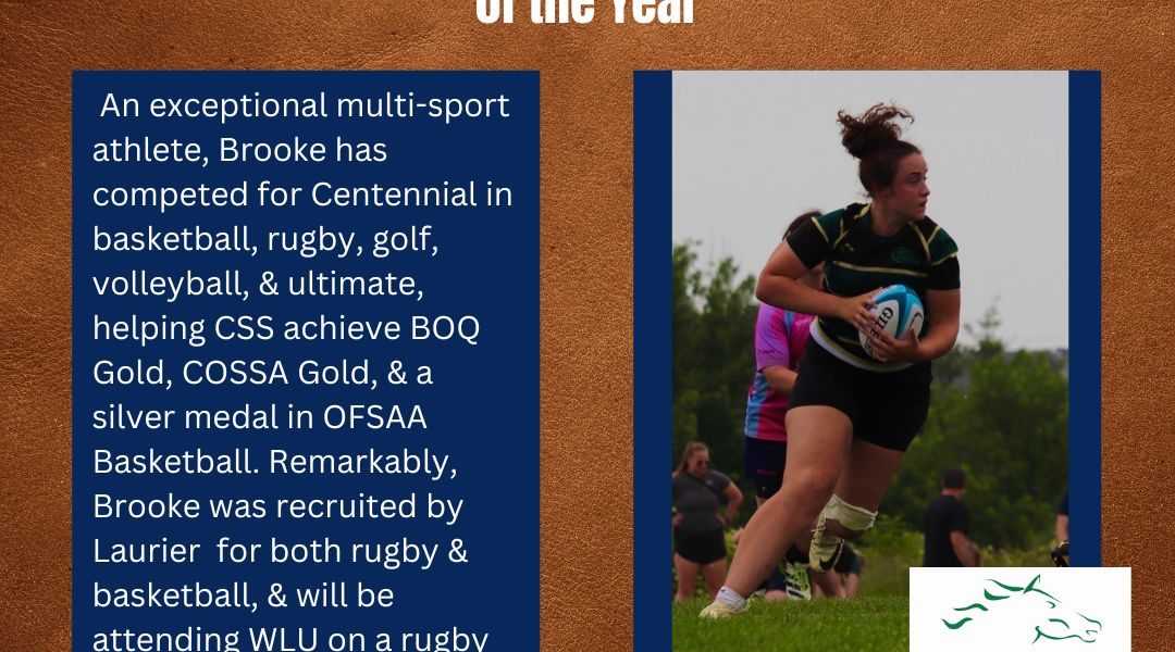 Brooke Gallagher, honoured as Centennial Secondary’s 2024 Athlete of the Year, is an exceptional multi-sport athlete and leader. Throughout her four years at Centennial Secondary School, Brooke has competed in basketball, rugby, volleyball, ultimate frisbee, and golf. She has particularly excelled in basketball and rugby. Brooke played a key role on Centennial’s basketball squad, helping the team achieve Bay of Quinte Gold and COSSA Gold, as well as a silver medal in the OFSAA Basketball Championship.