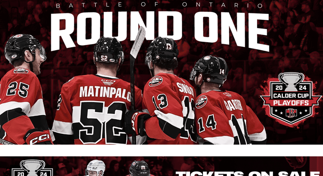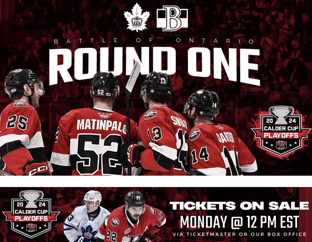 | Round One Matchup is Set The Belleville Sens will take on the Toronto Marlies in round one of the Calder Cup Playoffs! See schedule Game 1 (Home)Wednesday, April 24, 7 pm @ CAA Arena – Belleville vs Toronto Game 2 (Away)Friday, April 26, 7 pm @ Coca Cola Coliseum – Belleville @ Toronto Game 3 (Home) *if necessary* Sunday, April 28, 3 pm @ CAA Arena – Belleville vs Toronto Playoff tickets will go on sale tomorrow (Mon, Apr 22) at 12 pm est. Tickets can be purchased via Ticketmaster or at our box office in the QSWC. Box office hours are as follows:Monday, April 22 – 12 p.m. to 5 p.m.Tuesday, April 23 – 12 p.m. to 5 p.m.Wednesday, April 24 – 12 p.m. to 7:30 p.m. |