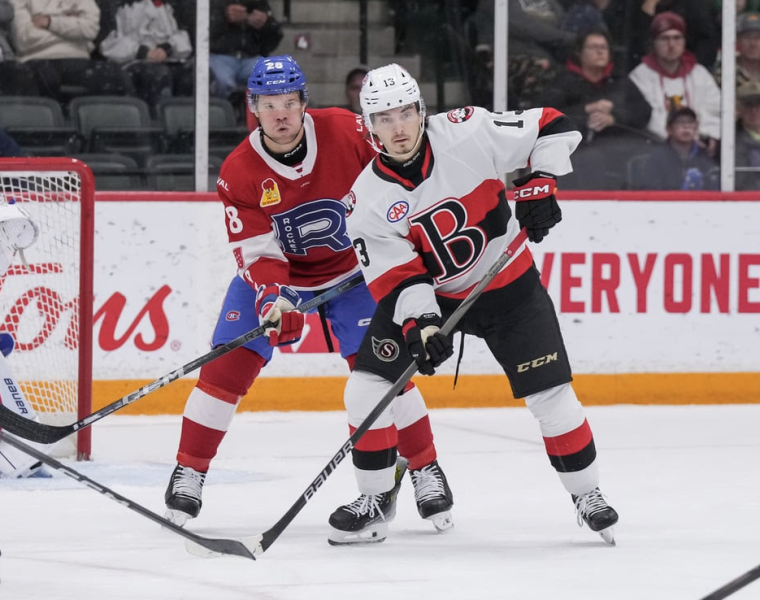 BELLEVILLE, ON – The Northern Division’s first place team the Laval Rockets were in town at the CAA Arena to take on the Belleville Senators on Military Appreciation Night. The Sens opened the scoring in the first period to make it 1-0 when Angus Crookshank was left wide open in front of the net and snapped his fifth goal of the season in the top shelf past Rockets goaltender