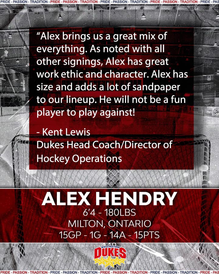 The Wellington Dukes are excited to announce the signing of 2007 born defenseman Alex Hendry! The Milton, Ontario native played last season with the U18 AAA Guelph Jr Gryphons and Elmira Sugar Kings of the GOJHL.