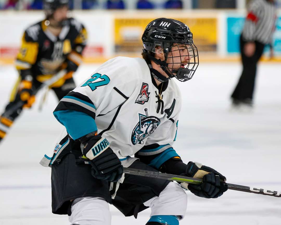 Noah Pardy scored for the Muskies at the 19-minute mark to snap the 4-4 tie and teammate William Jones helped secure the victory with an empty-net goal 36 seconds later as the Lindsay club improved to 13-16-0-4.