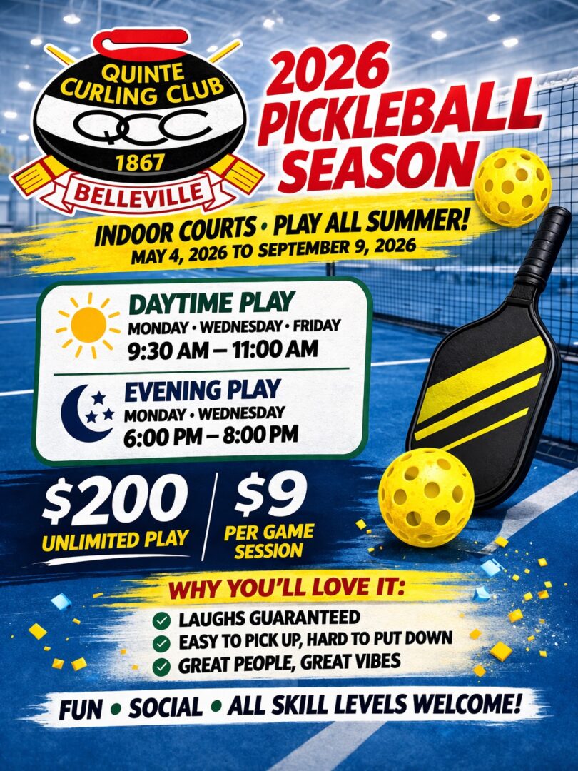 “The Quinte Curling Club is excited to welcome players back for the 2026 Pickleball Season, running May 4 to September 9 on our indoor courts. This fun, social, and fast‑growing sport is perfect for all ages and skill levels, offering a great way to stay active throughout the summer. Players can choose from daytime sessions on Monday, Wednesday, and Friday from 9:30–11:00 AM, or evening sessions on Monday and Wednesday from 6:00–8:00 PM. The season is flexible and affordable, with the option to pay $9 per session or enjoy unlimited play for $200.