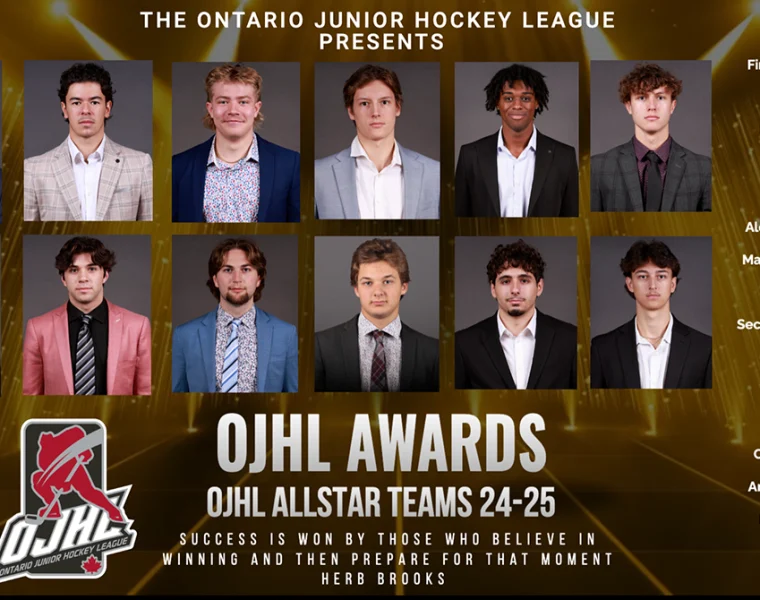 Toronto: Ontario Junior Hockey League MVP Dalton Bancroft of the Trenton Golden Hawks receives his league MVP award from David Leger (left) of the Ontario Hockey Association and OJHL Commissioner Marty Savoy at Scotiabank Pond on May 2, 2022. (Photo by Tim Bates / OJHL Images)