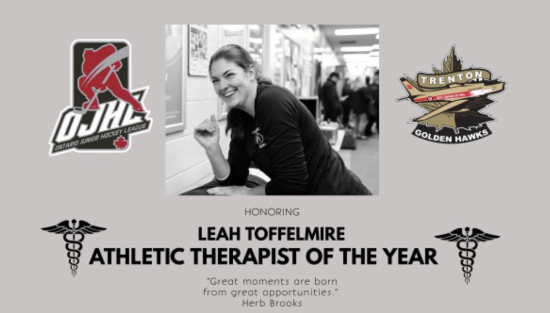 March 26, 2024, Mississauga, ON – ….  Leah Toffelmire of the Trenton Golden Hawks is the Ontario Junior Hockey League’s Athletic Therapist of the Year, the league announced today.