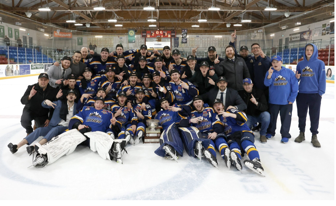 The Collingwood Blues celebrate after winning the Ontario Junior Hockey League Nutrafarms Championship Series in Trenton Monday night. The Blues won the best-of-seven series in six games.