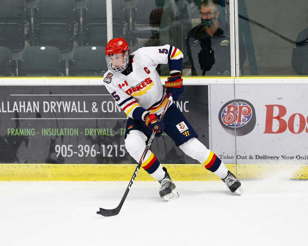 The Wellington Dukes scored late in regulation time to force overtime before the host St. Michael’s Buzzers prevailed 5-4 in Ontario Junior Hockey League action Thursday evening in Toronto.