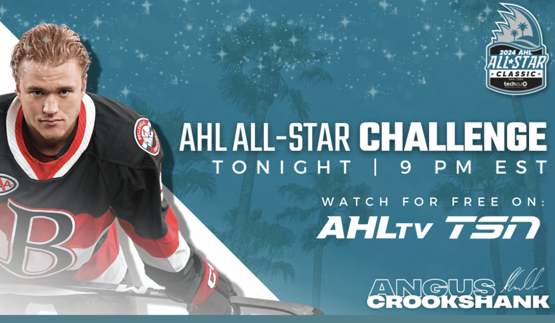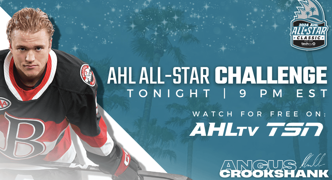 | It’s GAMEDAY!Be sure to catch our All-Star, Angus Crookshank, in action tonight at 9 pm ET for the #AHLAllStar Challenge in San Jose, California! Stream for free on AHLTV.com or TSN! (also available on the NHL Network) |